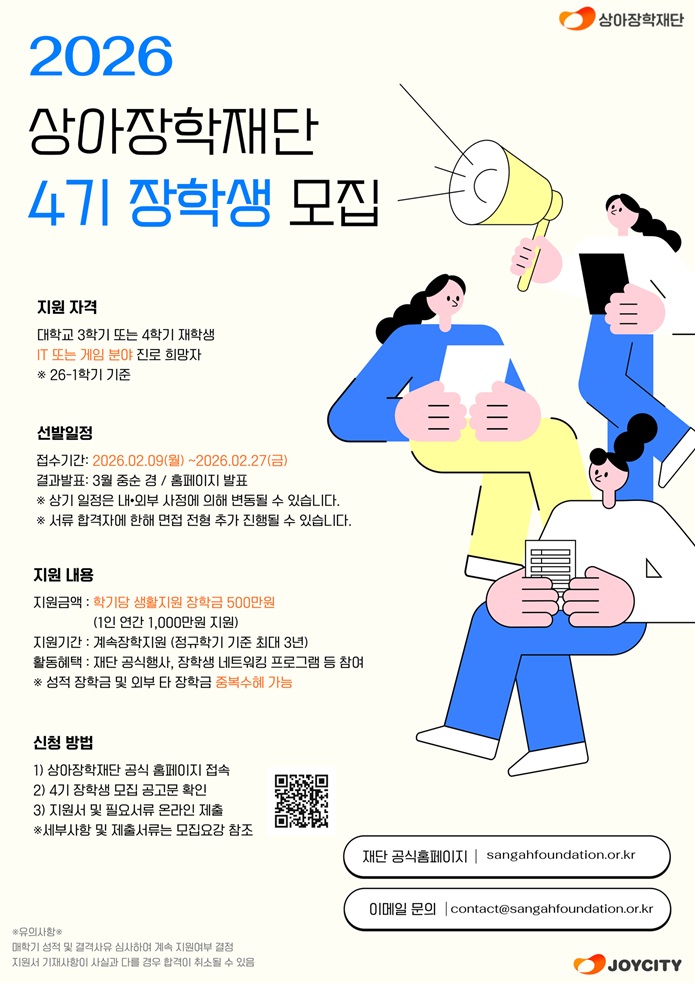 | 제목 | [교외-2/27]2026년도 상아장학재단 IT/게임 진로희망 장학생 모집 안내(재단지원) |